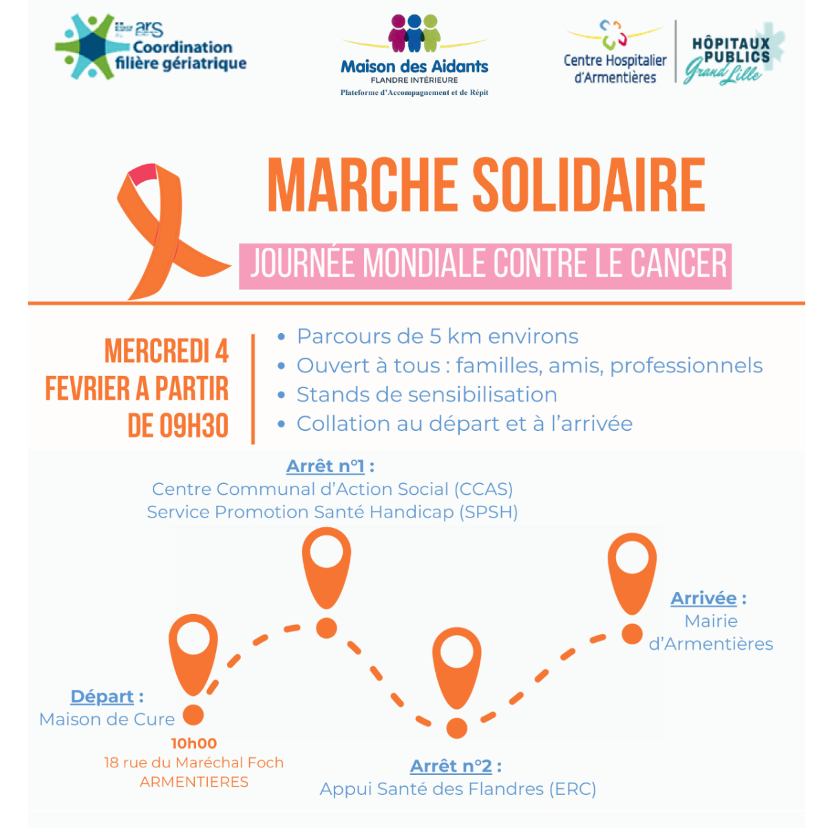 Dans le cadre de la journée mondiale contre le cancer, l'hôpital d'Armentières organise une marche solidaire le mercredi 4 février 2026 à partir de 09H30 afin de sensibiliser le public et de promouvoir la prévention ainsi que l'accompagnement des personnes malades et de leurs proches.