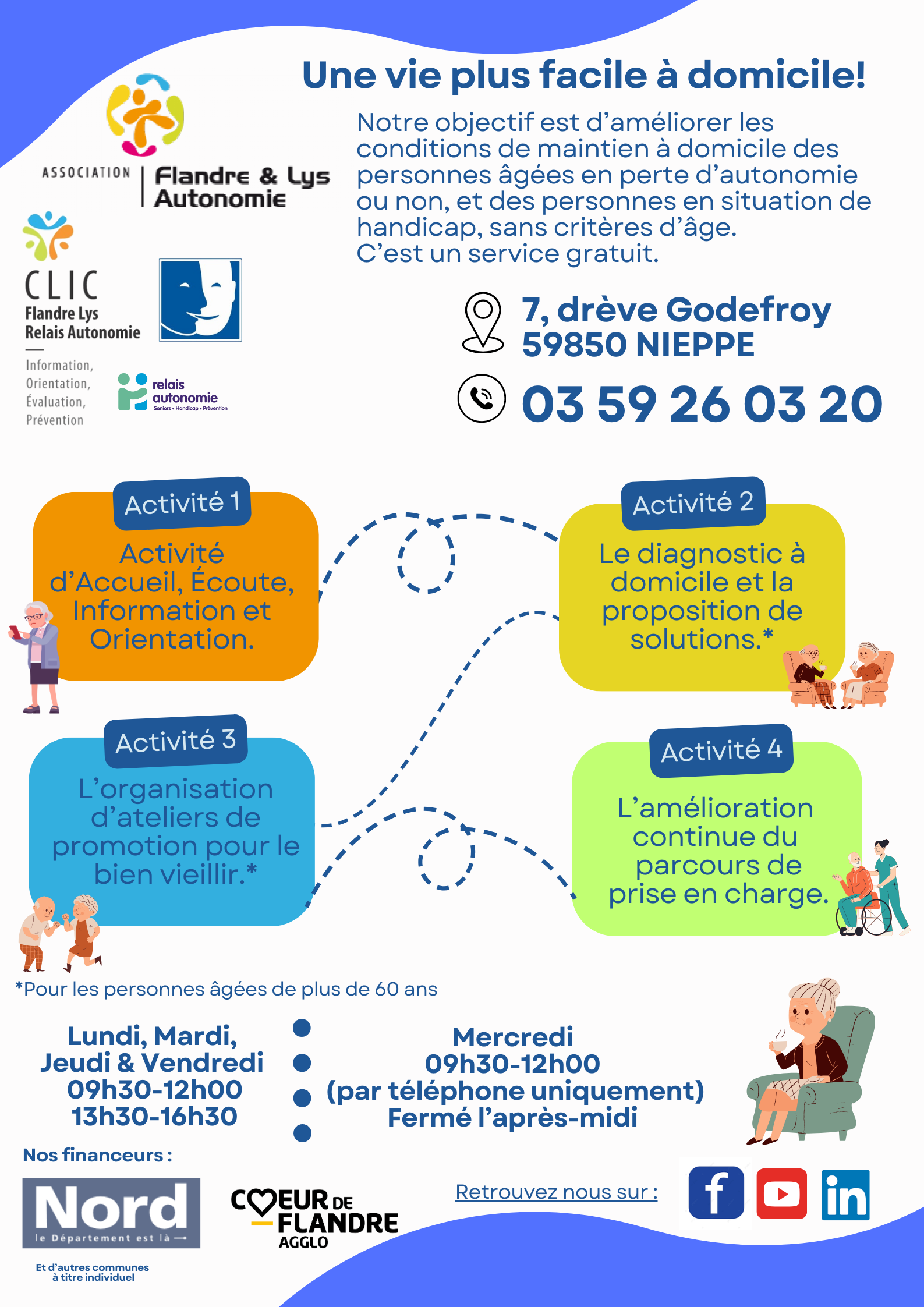 Le CLIC Flandre Lys - Relais Autonomie est un service dédié aux personnes en situation de perte d'autonomie du fait de l'avancée en âge ou d'un handicap.